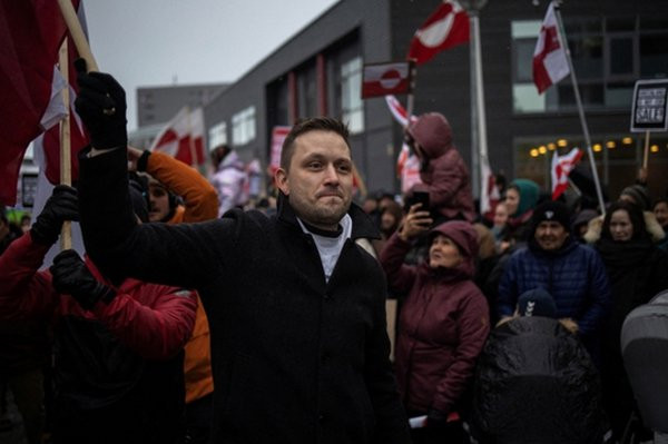 当地时间1月17日,格陵兰岛自治政府总理尼尔森参加岛上的抗议活动。ICPhoto
