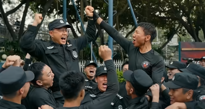 可没猜测新剧中他却化身特警大队的队长廖零散,独处腱子肉搭配特警制服,看时势还真挺像样的。
