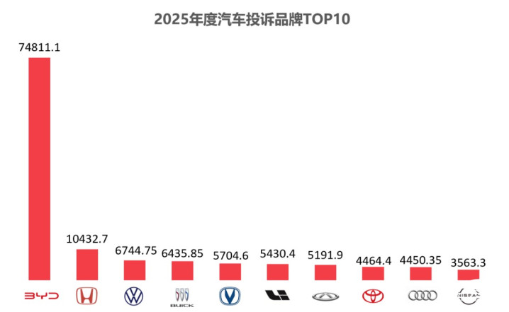 2025年度投诉品牌TOP10,本土品牌和海外品牌四六开。这其中,比亚迪依然以74811.1的投诉指数高居榜首,同比上涨了109%,迭代增配、续航里程不准、千里眼和哨兵模式缺失引发了车主的集中吐槽。本田的投诉指数同比上涨了49%,雅阁、飞度、皓影、本田CR-V是重点投诉车型。大众品牌因变速箱电脑板故障、轮胎开裂等问题引起了车主的不满,投诉指数同比上涨了20%。其余品牌投诉指数均在6500以下。