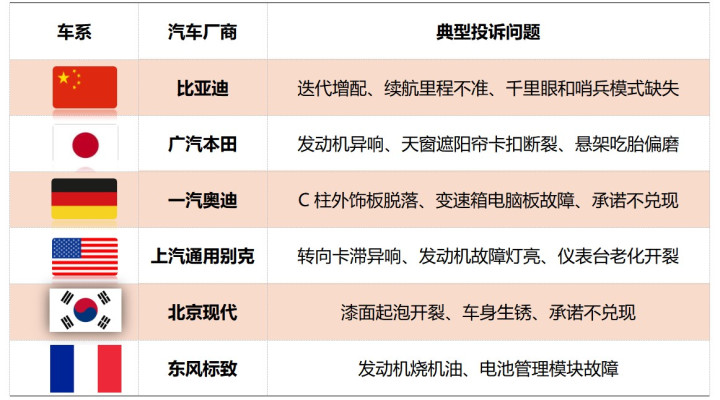 从投诉问题来看,迭代增配、车机老旧不升级、经销商不退订金及承诺不兑现等都是华系车的主要投诉问题。日系车的重点车型是雅阁、飞度、皓影、本田CR-V,悬架吃胎偏磨、发动机异响、部件老化开裂是车主投诉的主要原因。变速箱电脑板故障、轮胎开裂依然是德系车主的“心病”,而美系车的投诉主要围绕转向卡滞异响、发动机故障灯亮、仪表台老化开裂展开。