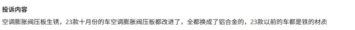 另有车主投诉表示,2021款马自达3昂克赛拉使用的空调膨胀阀固定压板严重生锈,但厂家从2023款后都换成铝合金,希望厂家能也能为问题车辆免费更换。