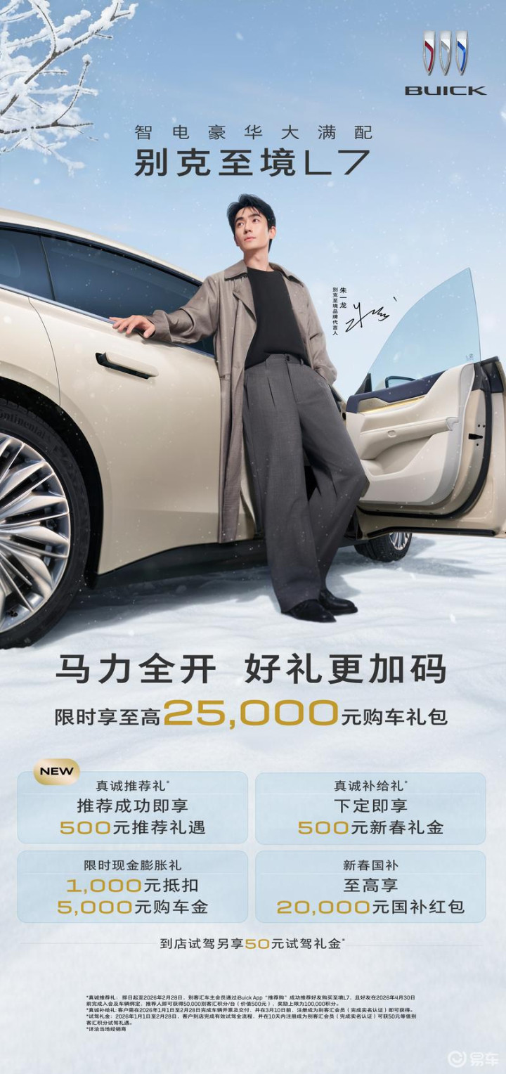 易车讯今日,别克品牌宣布:别克至境L7“马力”全开,以重磅好礼回馈用户!即日起至2026年2月28日购买别克至境L7的用户,在活动期限内完成车辆开票及交付,并在3月10日前注册成为别客汇会员,可享至高25000元购车大礼包。