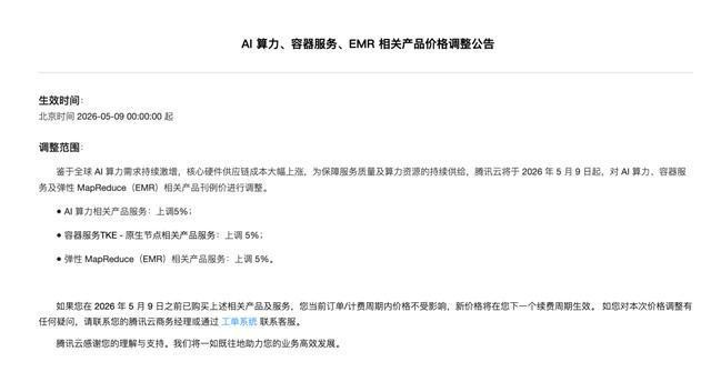 4月9日,腾讯云发布家具价钱转机公告。从5月9日起,AI算力关系家具、容器功绩TKE-原生节点、弹性MapReduce(EMR)三类家具的刊例价上调5%。距离3月11日腾讯云官宣Token调价相隔29天。
