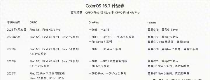 最初来看2026年4月30日这一批赢得ColorOS 16.1升级的机型。在OPPO品牌方面,包括OPPO Find N6、OPPO Find X9以及OPPO Find X9 Pro。这三款手机王人是OPPO在2026年上半年推出的高端家具,其中Find N6是折叠屏系列的最新成员,而Find X9和Find X9 Pro则是直板旗舰的法子版和进阶版。在一加品牌方面,2026年4月30日升级的机型有一加15和一加15T。一加15手脚一加数字系列的主力机型,其性能调校一直备受好评,一加15T则是主击柝强性能的版块。在真我品牌方面,同批次升级的机型包括真我GT8和真我GT8 Pro。真我GT系列一直以高性价比和苍劲性能著称,GT8系列的用户将率先体验到ColorOS 16.1的新功能。这一批次的推送时刻定在4月30日,距离缠绵公布只消半个月傍边的时刻,可见OPPO对这几款旗舰机型的醉心程度。