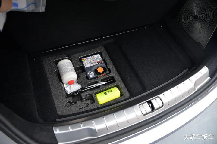 后备厢地板下方有额外的储物空间,配了充气泵和补胎液。