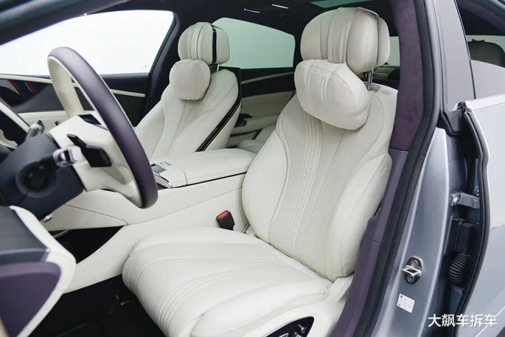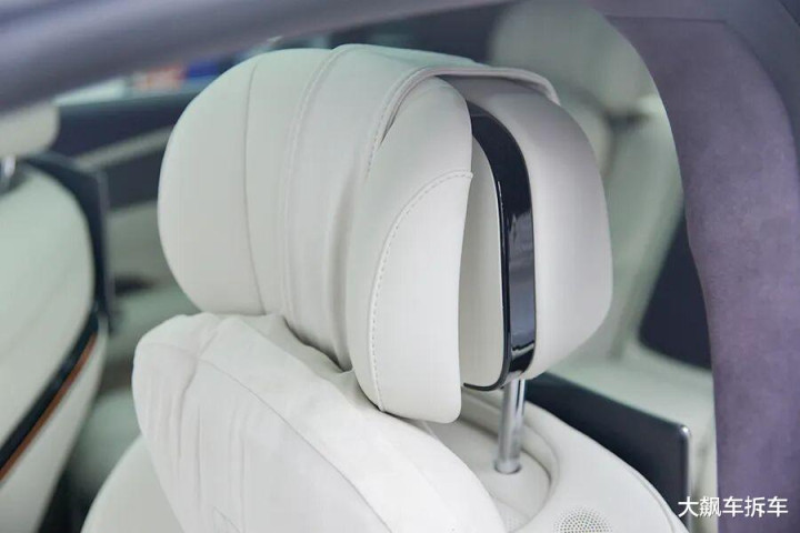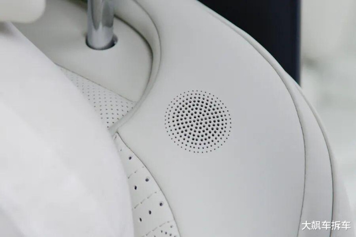 全系座椅都是皮质包裹,支持座椅加热通风及按摩,侧面包裹可以电动调节,转弯时还能自动增强支撑。头枕弯曲度可以自由调节,因此头枕扬声器放在了主驾驶左肩位置。