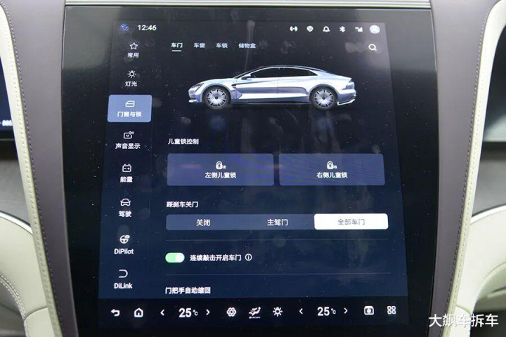 车机里可以选择踩下刹车踏板让四个车门同时关闭,和腾势一样。虽然看似方便,但踩刹车往往是司机下意识的动作,容易出现误操作。