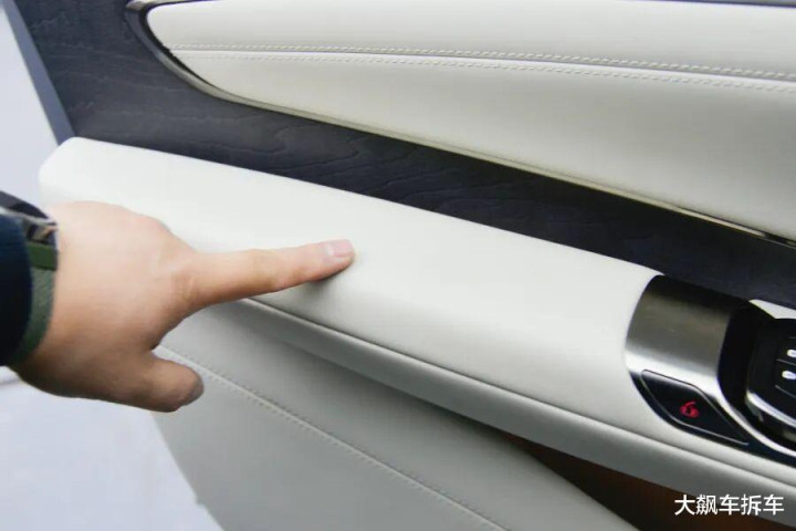 顶棚是翻毛皮材质包裹,车门不仅有软质包裹,就连门槛位置也都是软性材质包裹。同时,车门扶手、中央扶手还有电加热,确实够高级。