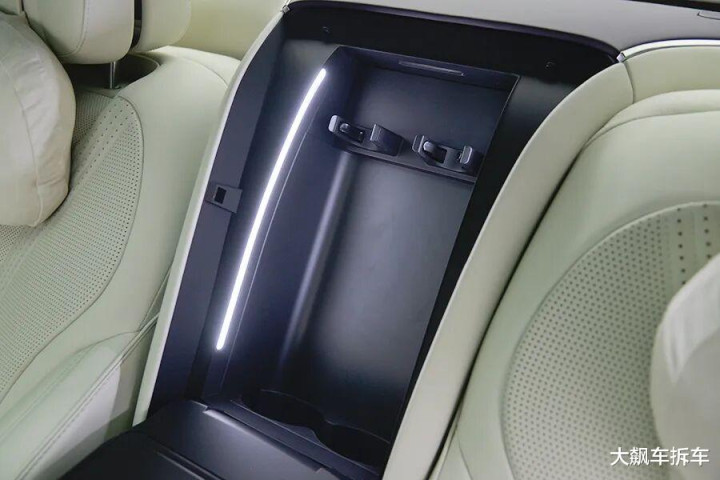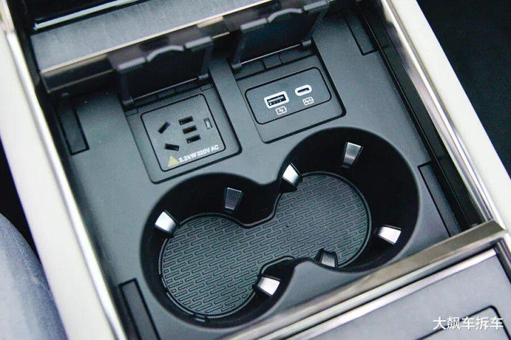 因为这辆车是四座车型,所以后排中央是一个平台,翻板下方配有一组水杯架(不支持冷暖),还有一个220V电源插口,一个USB接口以及一个Type-C接口。水杯架旁边放220V电源插口,总是感觉不安全,不过工程师应该会有安全措施。