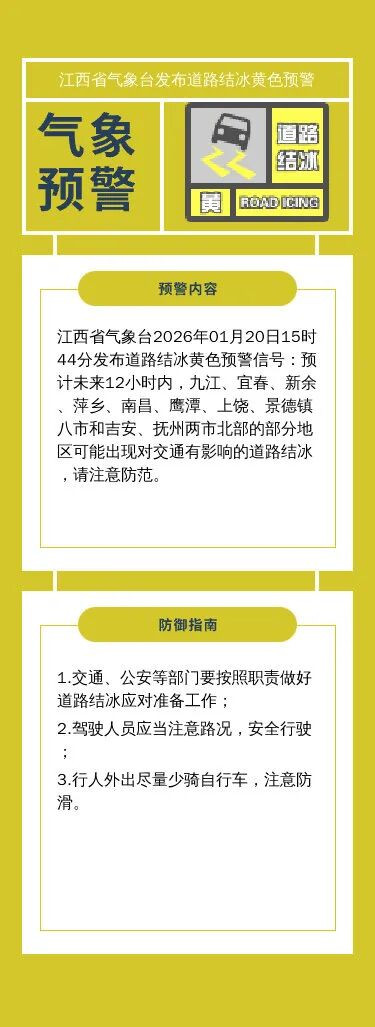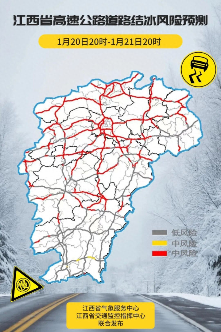 预计未来12小时内,九江、宜春、新余、萍乡、南昌、鹰潭、上饶、景德镇八市和吉安、抚州两市北部的部分地区可能出现对交通有影响的道路结冰。