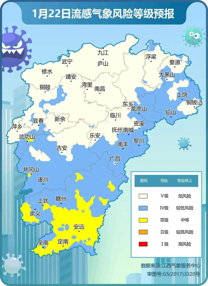 受雨雪降温过程影响,预计:20日20点至21日20点,除赣州东南部以外,全省大部地区将出现较高流感气象风险,21日,吉安南部、抚州南部和赣州市将出现较高流感气象风险。