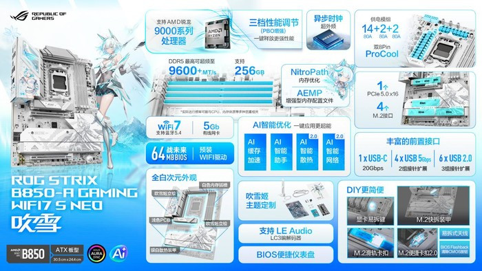 华硕ROG B850吹雪S NEO主板领有14+2+2供电模组(80A),能充分开释锐龙9000系处治器后劲。一样加入异步时钟,可完了CPU超外频,大幅进步超频天真性。一样领有AI缓存加快,一键开启后可权臣进步AI性能,赋能土产货化AI诓骗高效运转。内存方面一样加入NitroPath内存优化,搭配AEMP,内存频率至高可达DDR5-9600+(OC)。板载的4个M.2接口均配备高效散热片,可有用裁汰温度。除了主PCIe 5.0 M.2接口配备M.2快拆装甲外,M.2_3与M.2_4的散热片也守旧快拆研讨,搭配M.2方便卡扣2.0及滑轨卡扣,可免器具装卸SSD。同期板载1个前置USB 20Gbps Type-C接口、4个前置USB 5Gbps接口以及6个前置USB 2.0接口,可同期外接多个建造。相聚方面一样升级至5Gb有线网口,并守旧WiFi7。搭配吹雪姬主题银白易拆天线,即插即用,顺眼更好用。一样配备64MB大容量BIOS并预装WIFI驱动,为“战改日”作念好了准备。。还有显卡易拆键,一键即可拆卸显卡,让硬件升级与关怀变得前所未有的浅薄。音效部分一样引入新一代LE Audio本事,裁汰延伸,让游戏千里浸感全面进步。