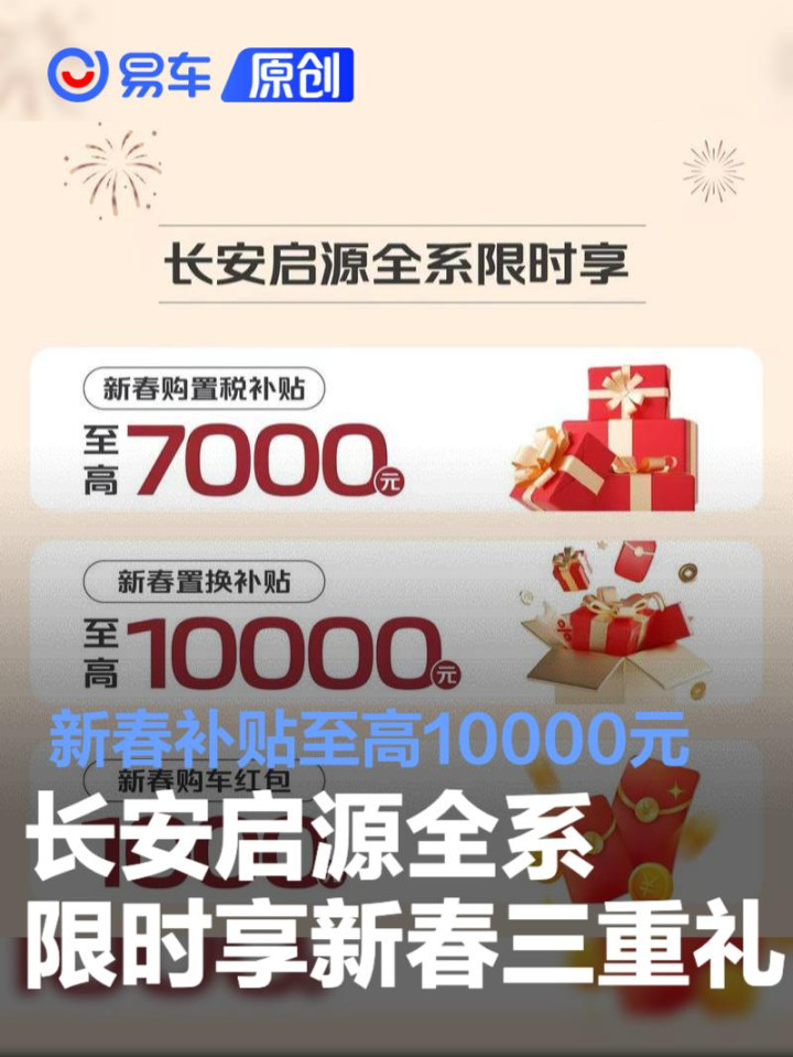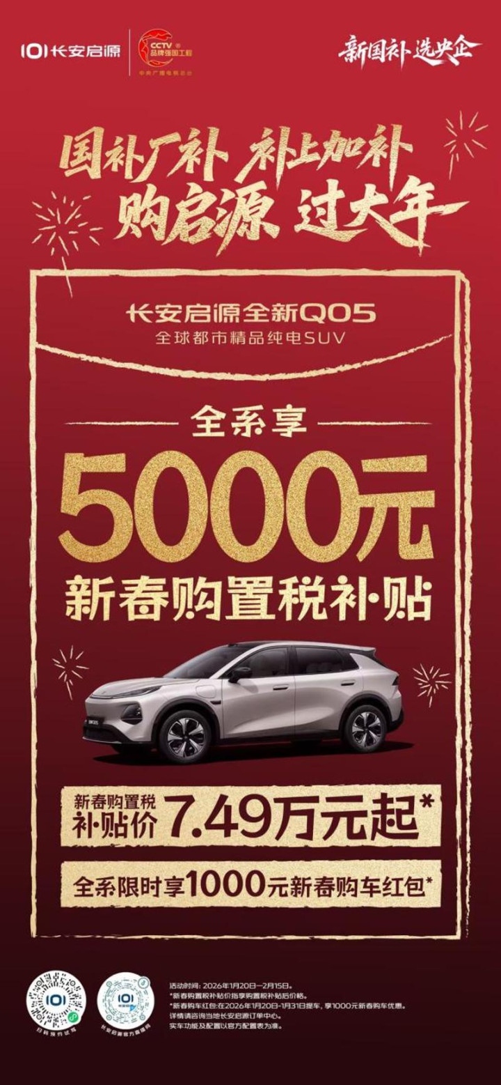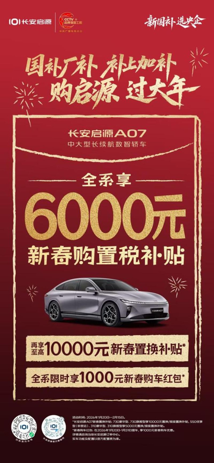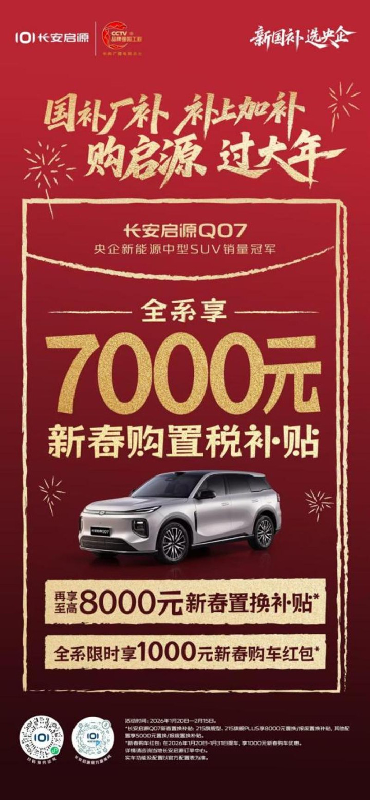 易车讯1月20日,长安启源推出“国补厂补补上加补购启源过大年”新春购车福利,在2026年1月20日至2月15日期间,全系车型限时享受至高7000元新春购置税补贴、至高10000元新春置换补贴、1000元新春购车红包三重政策加持。本次政策权益聚焦长安启源全新Q05、长安启源A06、长安启源Q07、长安启源A07四款车型。