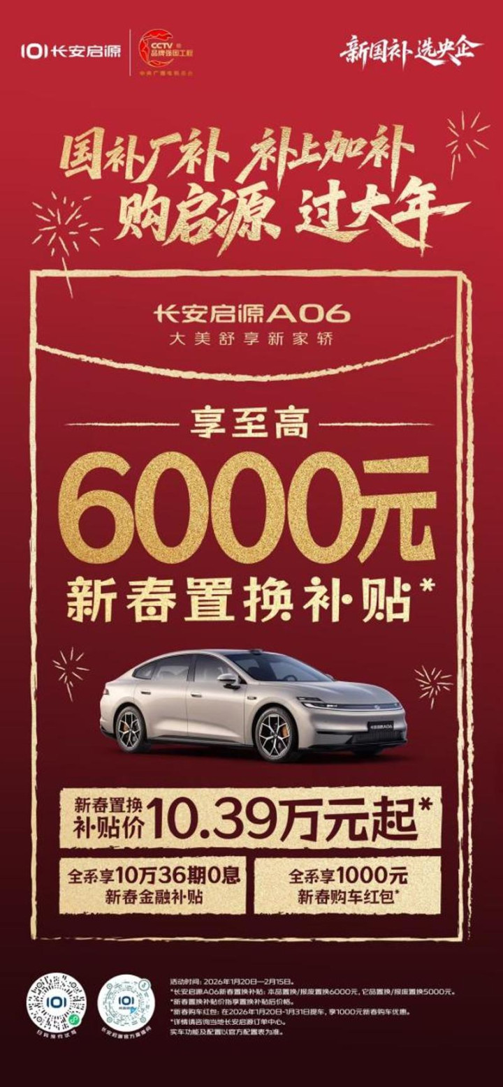 长安启源A06享至高6000元新春置换补贴,补贴价10.39万元起,还可享10万36期0息新春金融补贴,限时享1000元新春购车红包。