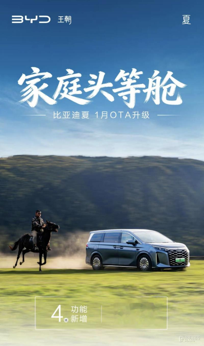 1月20日,从比亚迪官方获悉,旗下中大型MPV——比亚迪夏(查成交价|车型详解)开启OTA升级,新增行车记录仪和哨兵模式Wi-Fi快传、锁车音效功能等4项功能,同时优化NEDC工况油耗等5项功能。现款比亚迪夏于2025年11月4日上市,共推出4款车型,售价区间为20.68-26.98万元,新车搭载1.5T插混系统,CLTC纯电续航218km,并搭载带预瞄系统的云辇C、高速爆胎稳行系统等配置。