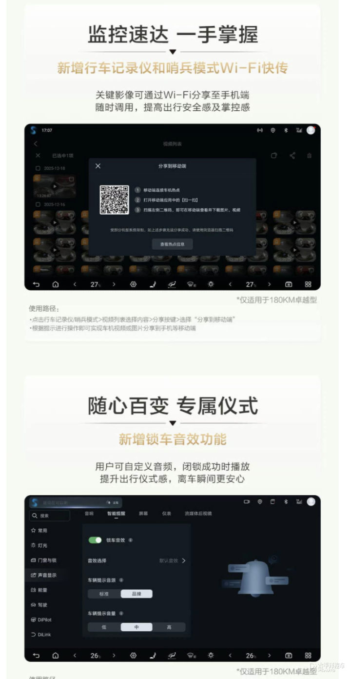 同时,还新增行车记录仪和哨兵模式Wi-Fi快传,关键影像可通过Wi-Fi分享至手机端随时调用;新增锁车音效功能,用户可自定义音频,闭锁成功时播放。