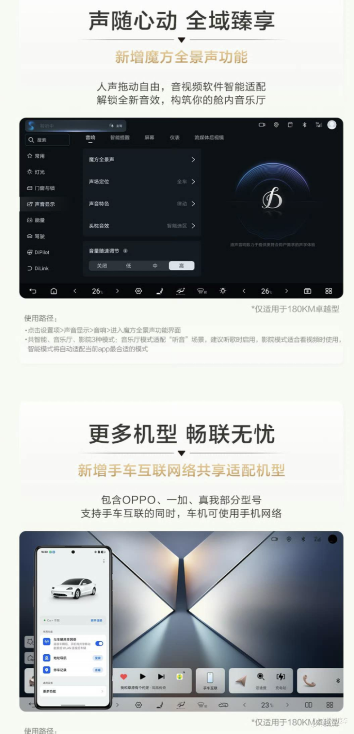 本次OTA升级后,将新增魔方全景声功能,可实现人声拖动自由,音视频软件智能适配;新增手车互联网络共享适配机型,包含OPPO、一加、真我部分型号,支持手车互联的同时,车机可使用手机网络。