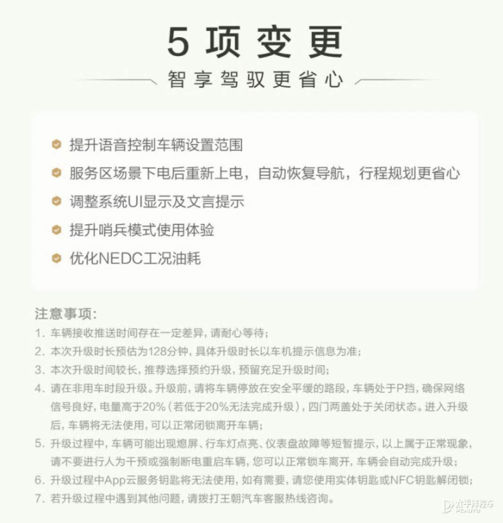 此外,还针对5项功能进行优化,包括提升语音控制车辆设置范围、服务区场景下电后重新上电,自动恢复导航、调整系统UI显示及文言提示、提升哨兵模式使用体验以及优化NEDC工况油耗。